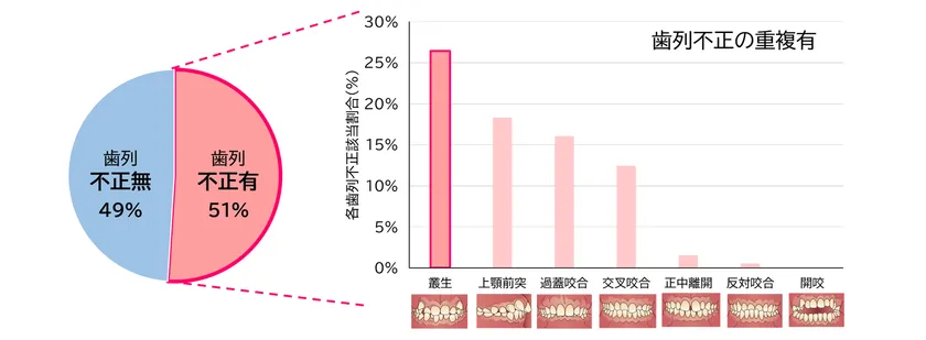 本調査は、乳歯から永久歯への生え変わりが進み、歯並びの状態が比較的安定してくる小学5、6年生を対象に解析しました。その結果、解析対象とした児童の半数以上が歯列不正を有し、その中でも、歯と顎の大きさが合わずに歯が部分的に重なる状態(叢生)の割合が最も多いことが確認されました(図1)。