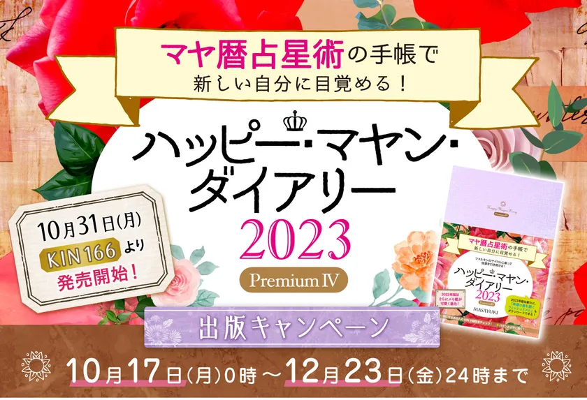 一般社団法人日本マヤ暦セラピスト協会(本部:東京都新宿区/代表理事:後藤 将之)は、2022年10月17日(月)より、2023年マヤ暦占星術の手帳『ハッピー・マヤン・ダイアリー2023 Premium IV』の予約受付を開始。5大特典のつく出版記念キャンペーンを2022年12月23日(金)まで実施します。