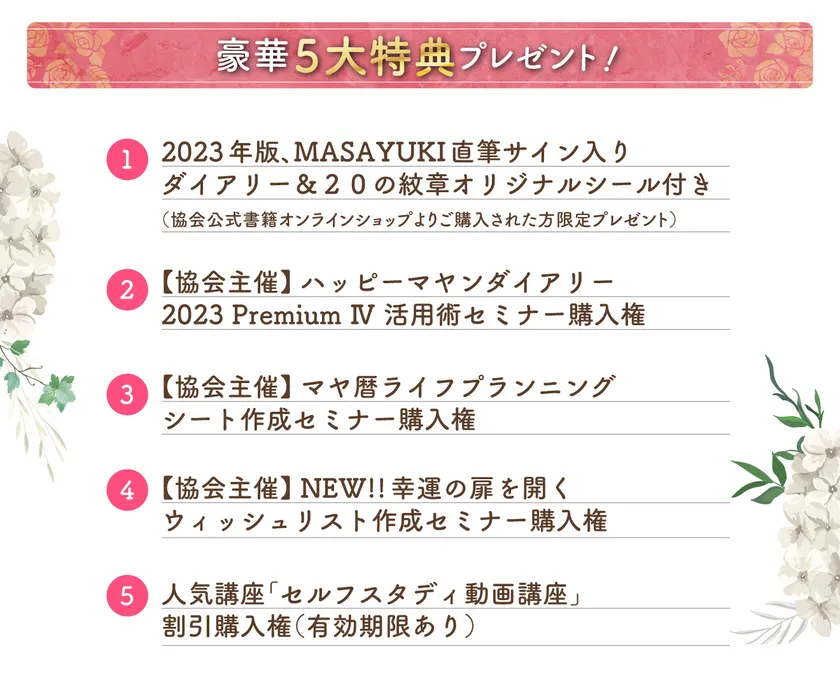 通常、発表後すぐに満席となってしまう大人気セミナーの優先購入権をはじめ、公式オンラインショップからの購入者には、家元・マヤ暦ソウルナビゲーターMASAYUKI直筆のサインやダイアリーに貼って楽しく活用できるマヤ暦20の紋章シールもプレゼント。