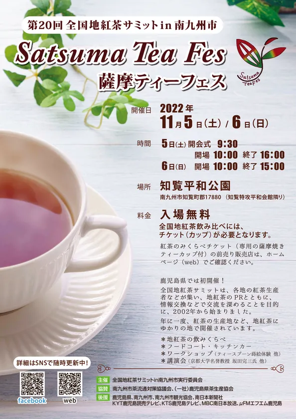 国内最大のお茶の産地 鹿児島県南九州市で第20回『全国地紅茶サミット in 南九州市』が11月5日(土)・6日(日)に開催されます。本サミットは、毎年秋に生産地で開催され、地紅茶の生産者が集うイベントとしては国内最大の祭典です。コロナ禍で2年ぶりの産地開催となる今回は、東北、中部、関東、関西、九州各県全国から約40団体が集結。会場の知覧平和公園では、「薩摩ティーフェス」として、薩摩焼オリジナルカップをチケットに、全国の地紅茶の飲み比べができたり、ワークショップでは蒔絵ティースプーンづくり、紅茶専門家の講演会など、地紅茶を味わい学び楽しむことができます。注目が集まりつつある日本の紅茶“地紅茶”の魅力を本イベントにて鹿児島から全国へ発信します。