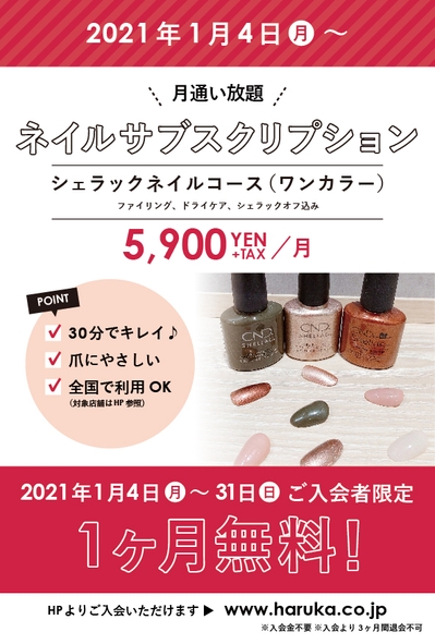 全国60店舗でヘアメイク&ネイルサービスを提供する「アトリエはるか」(株式会社アトリエはるか、所在地:愛知県名古屋市、代表取締役社長:西原良子)は、2021年1月4日(月)より全国11店舗にてシェラックネイルコースのサブスクリプションサービスを開始致します。