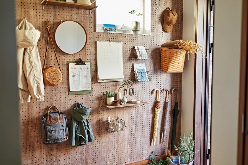 玄関横の有孔ボードも便利さとおしゃれが両立するお気に入りポイント