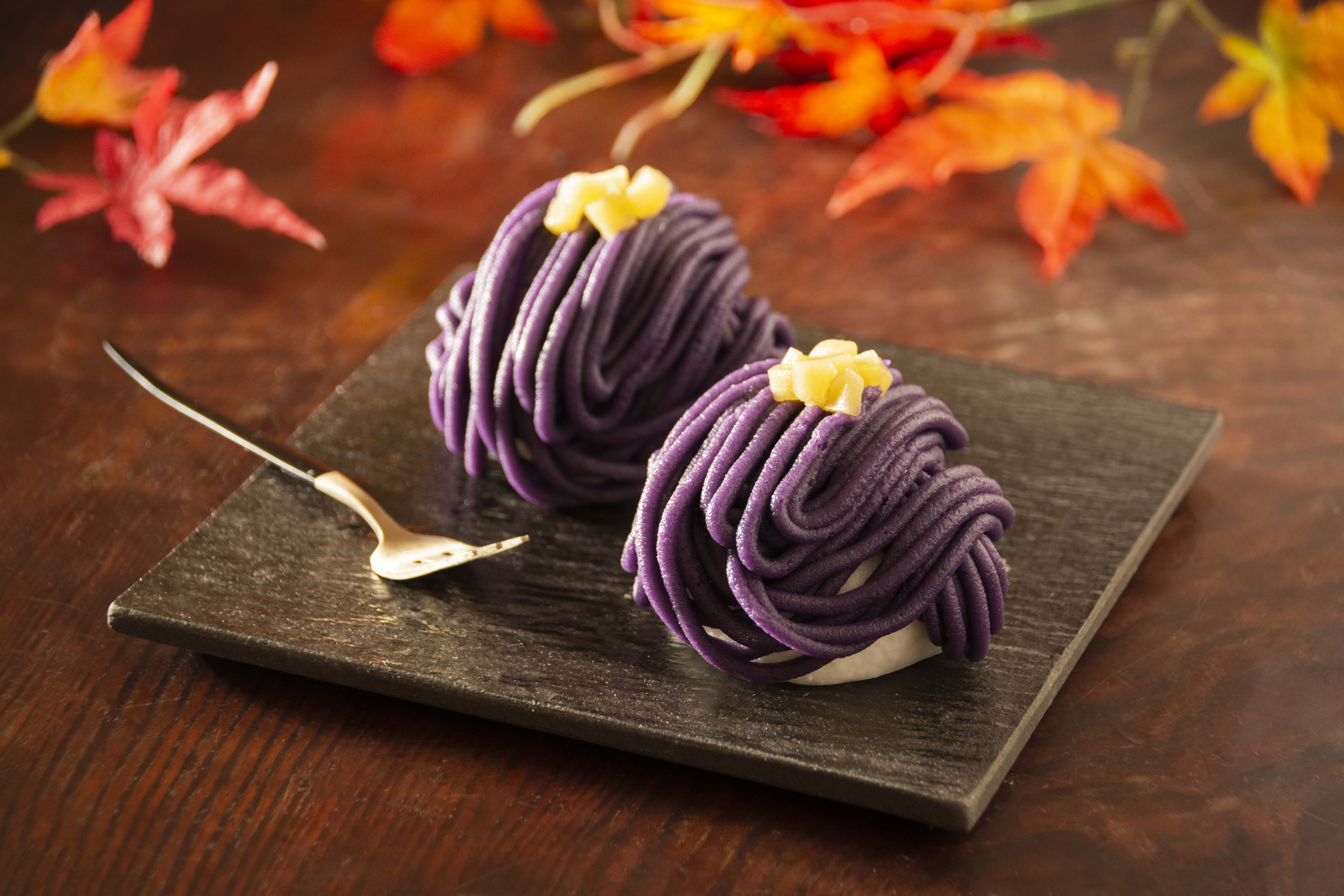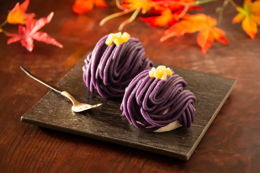 紫芋の焼き芋ペーストをたっぷりと絞った季節のモンブラン大福。