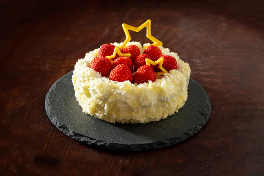 人気のスフレチーズケーキ「半熟ちーず」を4号ホールサイズにして、苺とチョコレートオーナメントをのせました。