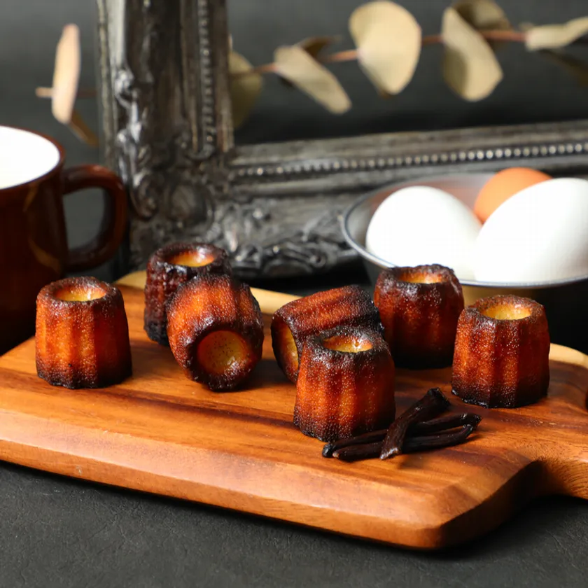 フランス語で「Cannele」は「溝の付いた」という意味で、その名の通り溝の付いた専用の型を使用して焼くのが特徴です。お店により材料や配合は違いますが、主に牛乳、ラム酒、バター、砂糖、薄力粉、卵黄、バニラ等を使用します。材料がプリンとほぼ同じということから、プリンでも使用している厳選素材を使いカヌレ開発をスタートいたしました。