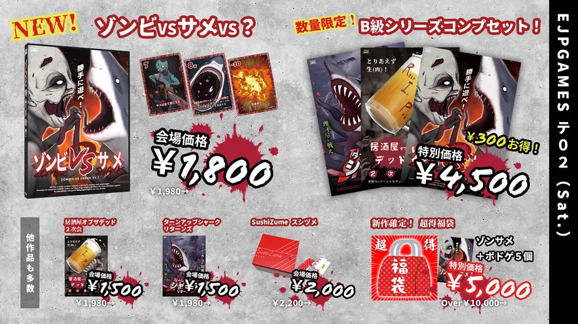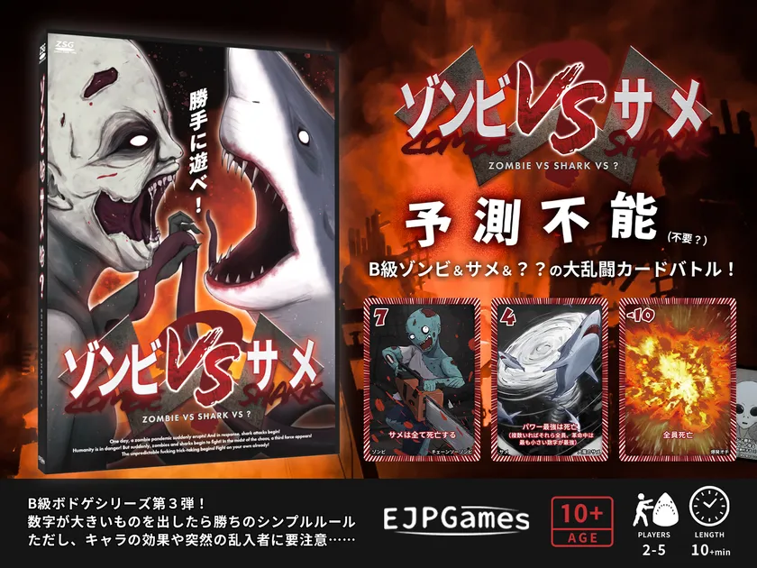 EJPゲームズ(運営:EJP株式会社)は、ゲームマーケット2022秋にて新作ボードゲーム『ゾンビVSサメVS?』を販売します。