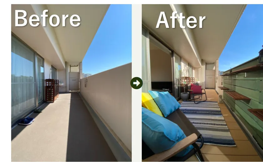 「ウッドデッキ工事」は、戸建てのお庭のような本格的なウッドデッキを設置できるメリットがありますが、施工に時間がかかるデメリットがあります。通常ベランダは、マンションの場合だとリビング空間、戸建てだと寝室から出入りする必要があります。工事期間中は、職人たちが出入りや資材置き場に使用することとなるため落ち着いた日常生活を営むことができません。