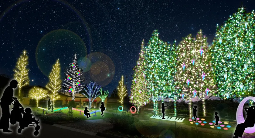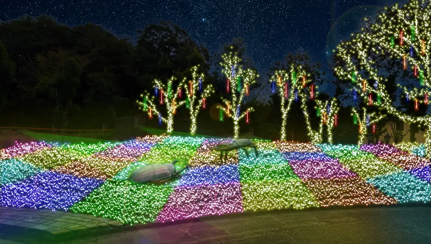 「煌めく虫たちのエントランス」では、色とりどりのイルミネーションの中に生息するカブトムシやカマキリなど巨大な「ロボット昆虫」がお出迎え。光り輝くメタセコイアの街路樹に囲まれた「輝きのプレイ広場」は、光るブランコやシーソーのほか、鍵盤や円形のライトを踏むと色が変わったり、音が鳴る仕掛けなど光と音のコラボレーションをお楽しみいただけます。イルミネーションで覆われた70メートルの「光の道」は、写真スポットにお薦めです。大人からお子様まで、園内を散策しながら幻想的なイルミネーションをお楽しみいただけます。