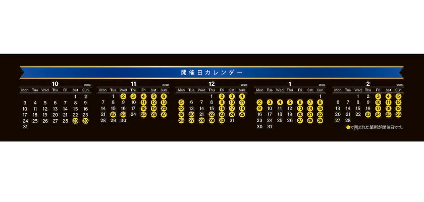 2022年10月29日(土)~2023年2月26日(日)の金曜~日曜・祝日・祝前日を中心に70日間開催します。