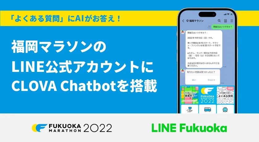 LINE株式会社(本社:東京都新宿区、代表取締役社長:出澤 剛)、福岡を拠点とする子会社のLINE Fukuoka株式会社(本社:福岡県福岡市博多区、代表取締役社長 CEO:鈴木 優輔、以下 LINE Fukuoka)は、11月13日(日)に実施される福岡マラソン2022にOFFICIAL COMMUNICATION PARTNERとして参画しています。LINE Fukuokaは、テクノロジーとコミュニケーションの力で大会を盛り上げるべく、福岡マラソン実行委員会と連携して実施する企画の第二弾として、LINEグループのAIテクノロジーブランド「LINE CLOVA」のチャットボット「CLOVA Chatbot」を福岡マラソン2022 LINE公式アカウントの「よくある質問」(お問い合わせ機能)に導入し、10月21日(金)より運用を開始したことをお知らせいたします。