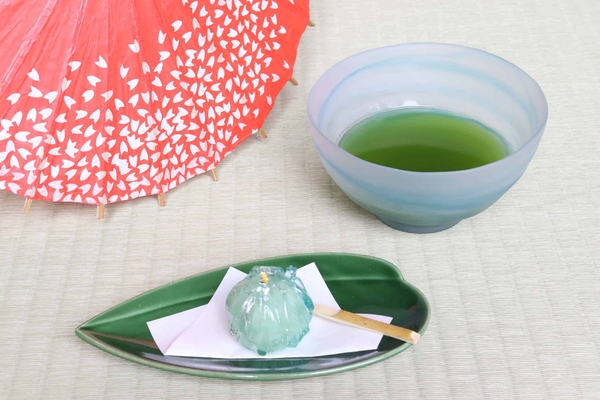 館内にあるお茶室を、雨をテーマにした「縁雫茶室」として設えます。雨粒をイメージした可愛らしいお茶菓子と、雨を彷彿とさせる涼やかなガラスの抹茶椀で一服し、旅の疲れを癒すことができます。また、お茶室には和傘や紫陽花が設えられており、雨の期間限定の特別なひとときを楽しめます。