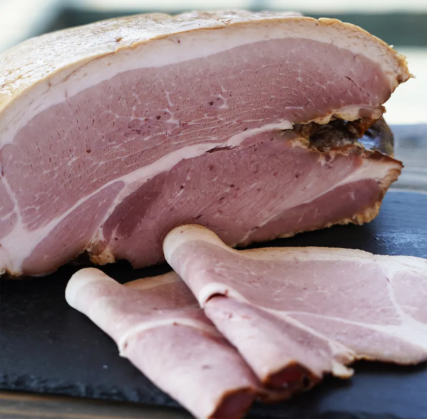 蔵王連峰を望む宮城県柴田郡の自社農場にて、一頭一頭大切に育てて出来上がった贅豚のモモ肉を丸ごと一本、じっくりとブナのチップで燻し、そしてゆっくりゆっくりと半日かけて火入れをし、香り豊かでしっとりと柔らかな数量限定の特別なハムです。