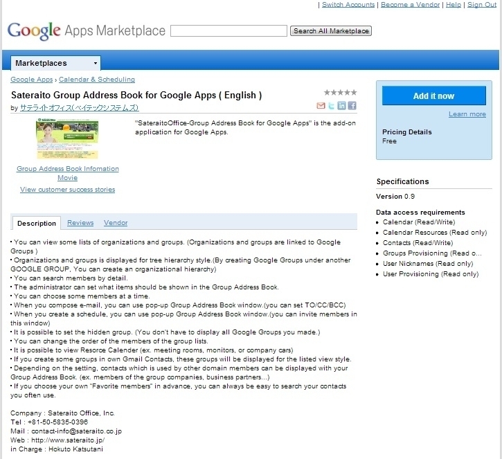 Google Enterprise Partnerであり、Google Apps for Business (以下 Google Apps )の販売代理店である株式会社サテライトオフィス(本社:東京都江東区、代表取締役社長:原口 豊)は、Google の Google Apps を使った社内情報システムの導入支援サービス(サテライトオフィス・プロジェクト、 http://www.sateraito.jp/ )の中で、Google Apps を導入した企業向けに、組織または、グループのアドレス帳機能、組織カレンダー機能を、Google Apps Marketplace から提供しております。このたび、これらに加えて、英語版をGoogle Apps Marketplace でリリースいたしました。