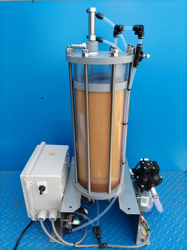 ♭脱乾は常設型の脱水乾燥装置「脱乾」より派生した、少量多品種、研究開発用途向け卓上サイズの脱水乾燥装置です。脱乾導入前の検証や、各種サンプル試験に最適です。固液分離~脱水乾燥まで、手軽に行うことができます。