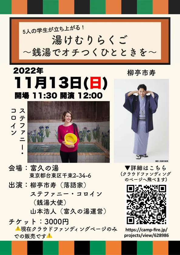チケットは現在、クラウドファンディングサイト「CAMPFIRE」にて購入が可能です。当日は落語家の柳亭市寿さんや、銭湯大使のステファニー・コロインさんが出演し、銭湯と落語の両方に興味を持っていただけるような内容をお届けする予定です。