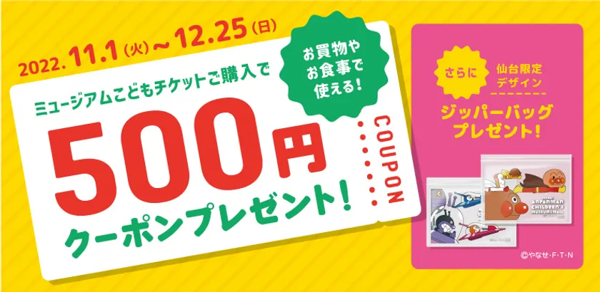 11月1日(火)~12月25日(日)の期間中、ミュージアムこどもチケットご購入で仙台アンパンマンこどもミュージアム&モールのお買い物やお食事で使える「500円クーポン」と「仙台限定デザインのジッパーバッグ(非売品)」をプレゼントします。