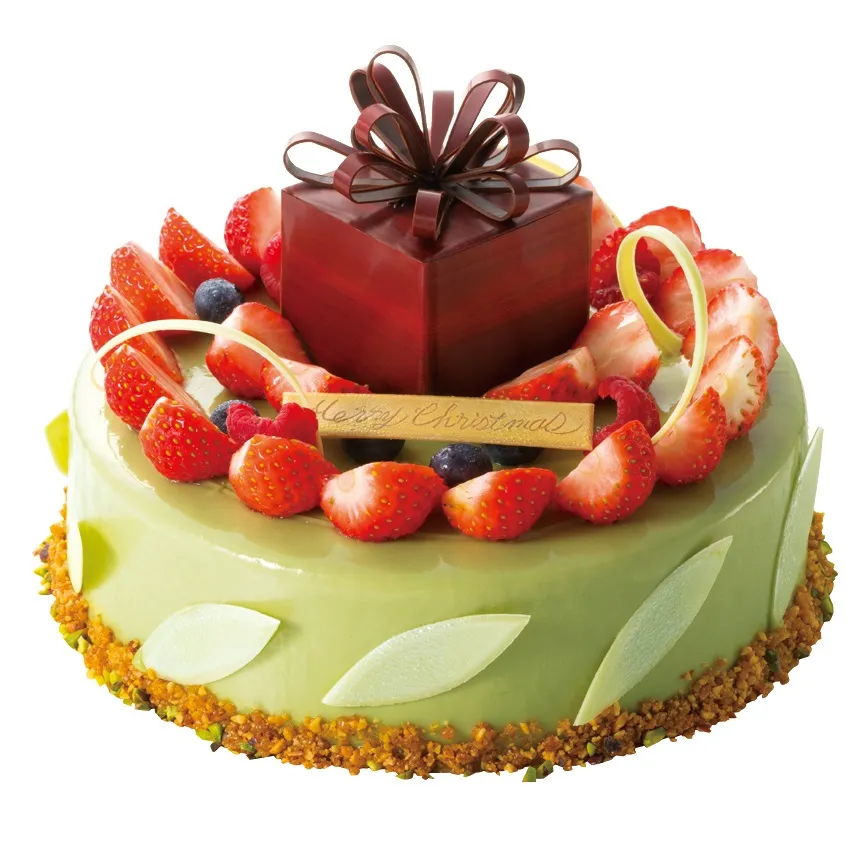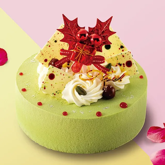 濃厚なピスタチオのバヴァロワの中に甘酸っぱいグリオットのムースとジュレ、ピスタチオとショコラの2種類のビスキュイを合わせたグリーンが鮮やかなクリスマスケーキ。