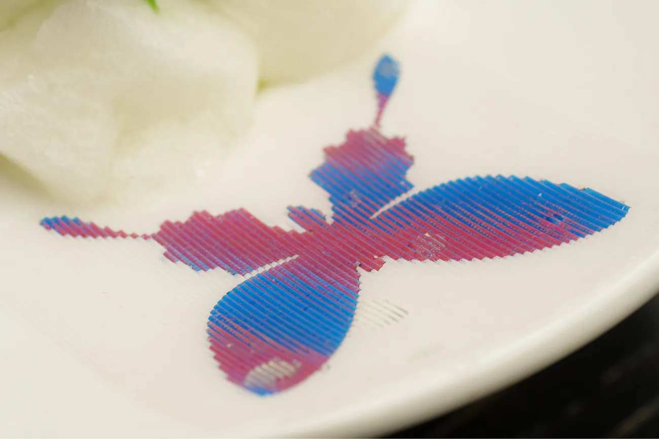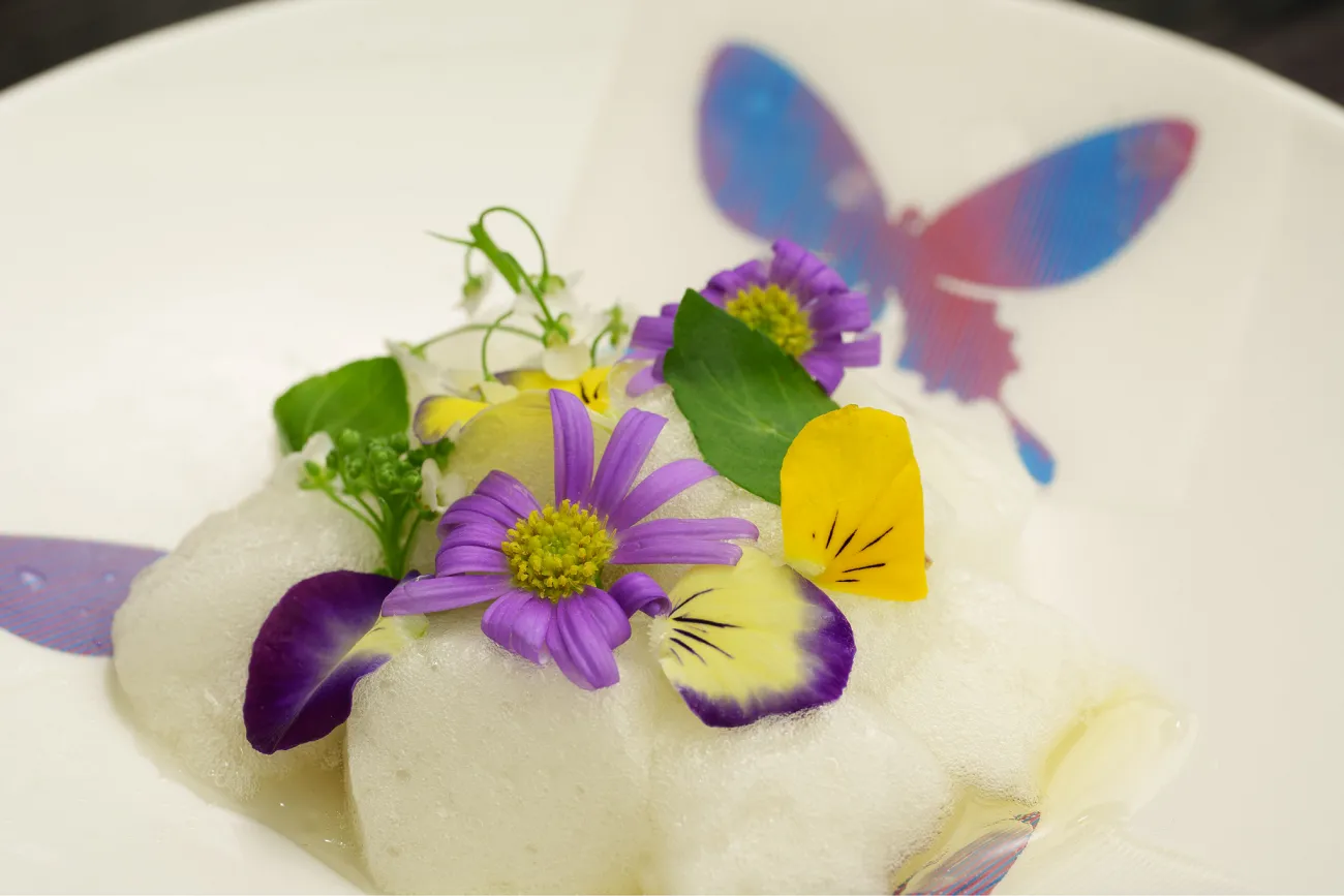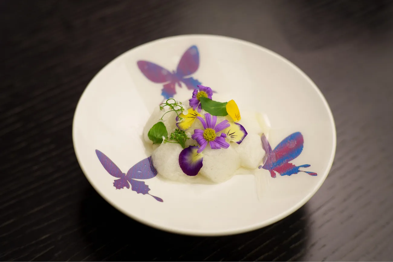 「elan vital」(エランヴィタール)は2016年にオープンした「5Dレストラン」であり、プロジェクションマッピングや分子ガストロノミーなどを用いて新しい食体験を追求しています。シェフの深作直歳氏と藤原俊城氏が試作したティラミスは、花に集まる蝶を表現した作品で、エディブルフラワーがのったムースとなっています。そして、それを囲む3匹の蝶が、共同研究によって作られたゼリーであり、見る方向によって色・模様が変わるものとなっています。
