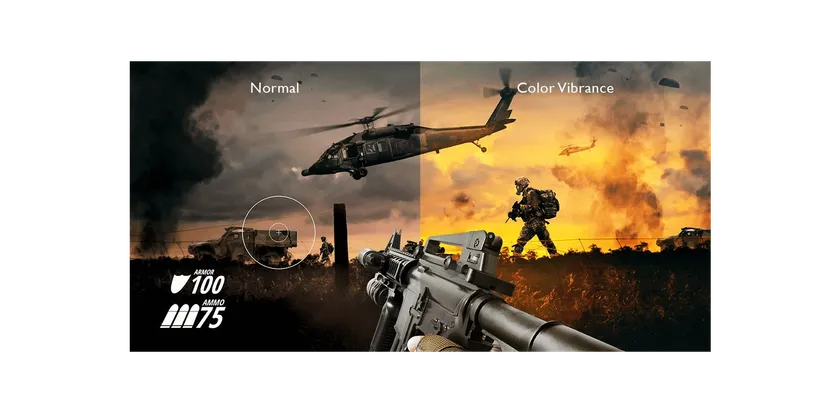 Color Vibrance機能では、色の鮮やかさを調整することで、より立体的な映像表現が可能です。これにより、敵を見つけやすい状態にすることができたり、敵に照準が合わせやすくなったり、背景色を明瞭にすることもできます。