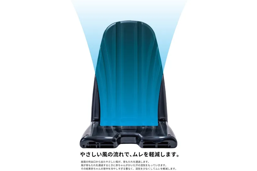 air seatは座面と背面をカバーする二つ折りのプレートで構成されており、座面の吹出口から出たやさしい風が、背もたれを通過するときに赤ちゃんがかいた汗の湿気を連れていきます。