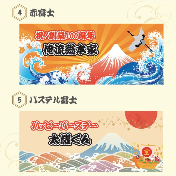 海や祭りの活気を感じさせる「大漁旗風デザイン」を採用した名入れ対応シリーズ。富士山や荒波、鶴を大胆にあしらい、縁起の良い和風モチーフで仕上げました。ブランケットやタオルに、お名前・企業名・店名・記念日などを自由に名入れでき、創業記念・長寿祝い・贈答品・応援グッズなど多彩なシーンで活躍します。1枚から作成可能で、販促用やイベント記念品としても最適な一品です。