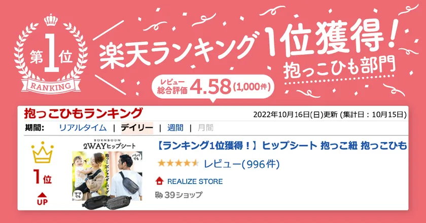 REALIZE合同会社(所在地:神奈川県横浜市、代表:林田 一弥/岩島 諒)は、好評につき売り切れとなっていた2wayヒップシート「BORN BOON ボーンブーン」の予約販売を、2022年10月15日より楽天市場店で再開しました。販売再開初日で楽天市場内の抱っこひもランキングで1位を獲得したことをお知らせします。(お届けは11月下旬を予定)