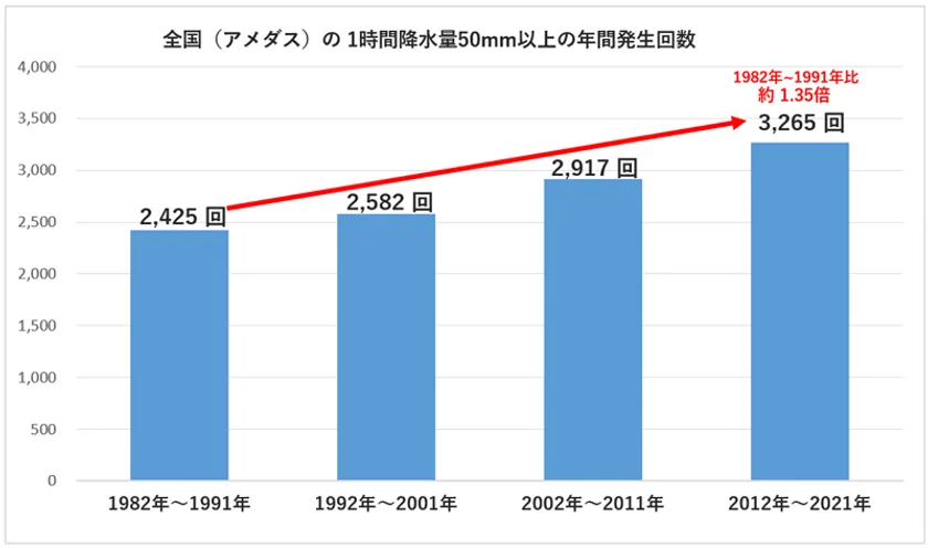 1時間に50mm以上の「非常に激しい雨」の頻度は年々増加しています (気象庁データより 積水ハウスが作成)