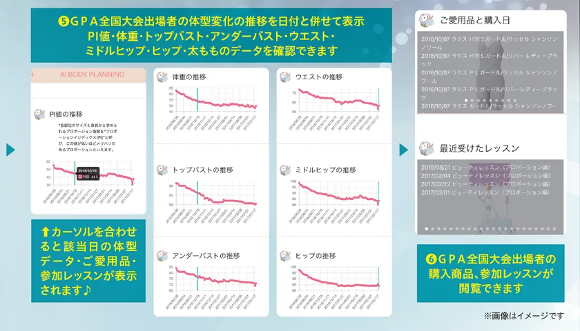 利用者の「年齢」「身長」「体重」「お住まいの都道府県」を入力すると、その情報に近いダイアナで理想の体型を手に入れた方※の「体型変化前」のデータがヒットします。その方の体型変化の推移や使用した商品や参加したレッスンなどを表示してくれるので、利用者に近い理想体型を手に入れた方の“成功までの道のり”を知ることができます。