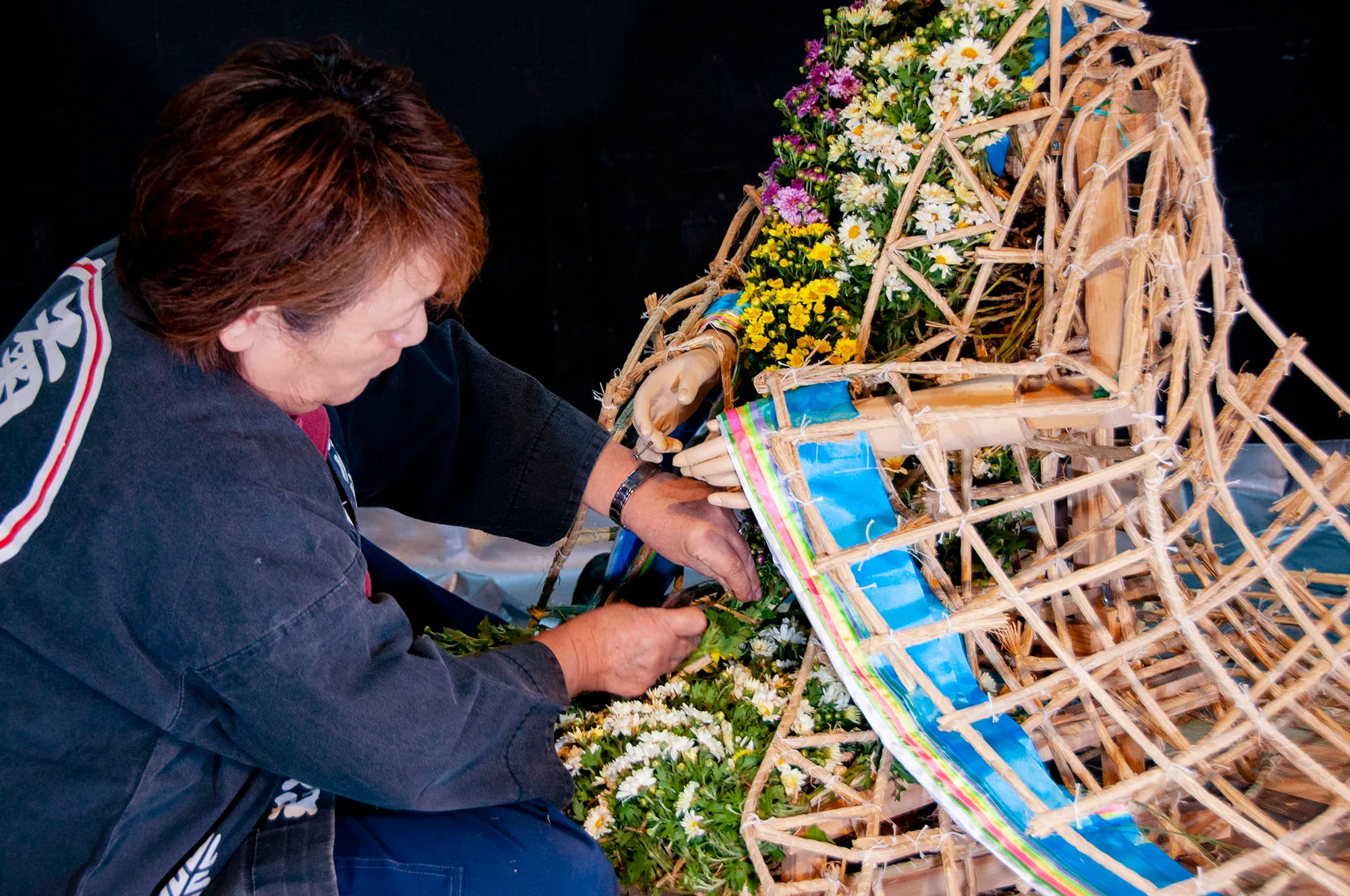菊人形の制作過程である人形への「菊付け」を、伝統技術を継承する菊師が実演します。