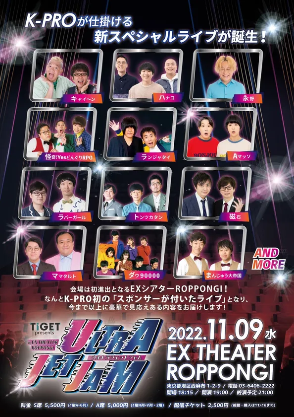 テレビ朝日「アメトーーク!」でも取り上げられたお笑いライブ主催会社「株式会社K-PRO」は、新スペシャルライブの第一回目『ULTRA JET JAM』を六本木のEX THEATER ROPPONGIにて2022年11月9日(水)に開催いたします。