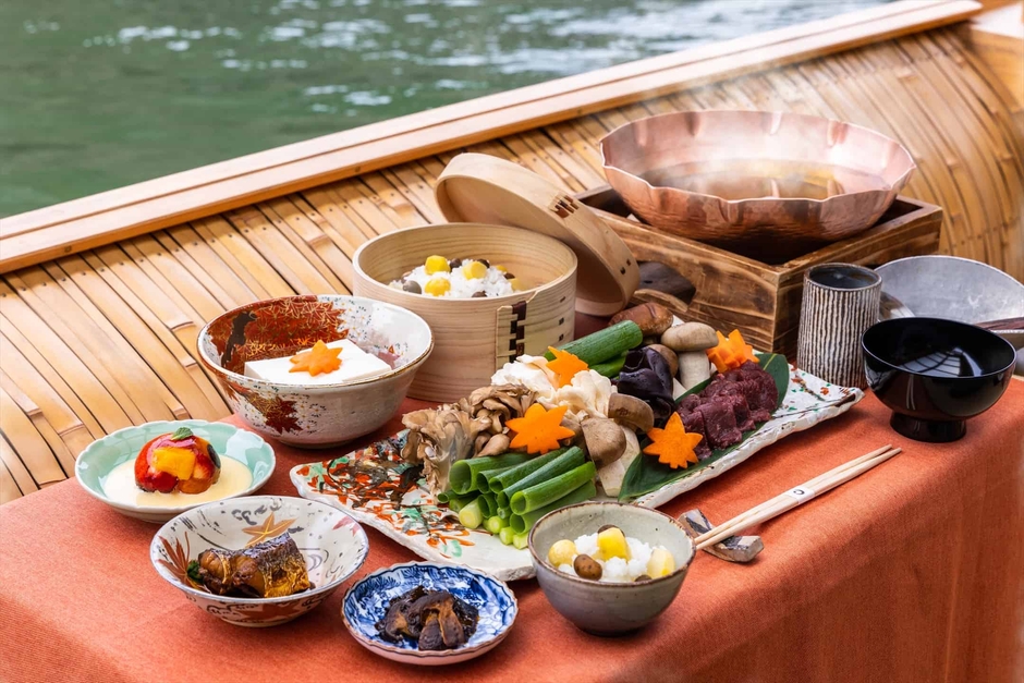 屋形舟「翡翠」では、総料理長特製の朝食を提供します。メインは、平安貴族も舌鼓を打った(*4)、鹿肉のロースにたっぷりのきのこを合わせたもみじ鍋です。きのこの旨味に加え、赤身独特の滋味深さが楽しめます。その他には栗、銀杏、むかごなど秋の木の実をふんだんに使い昆布出汁で焚き上げた御飯、松茸の佃煮やさんまの有馬煮などを用意します。甘味は、柿、梨、巨峰などの秋の果物をゼリー寄せにし、秋の味覚を存分に堪能できる朝食です。紅葉の一本一本が際立ち、錦の絹織物のように広がる風景を眺めながらゆったりと楽しめます。