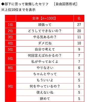 ■部下に言って後悔したセリフ 1位「頑張って」2位「どうしてできないの?」3位「やる気あるの?」