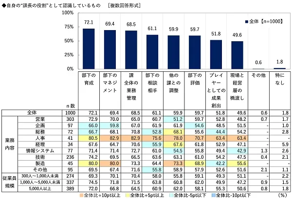 まず、全回答者(1,000名)に、自身の“課長の役割”として認識しているものを聞いたところ、「部下の育成」(72.1%)が最も高くなりました。人材の育成を行い、組織力の底上げを図ることを“課長の役割”と捉えている人が多いようです。次いで高くなったのは、「部下のマネジメント」(69.4%)、「課全体の業務管理」(68.5%)、「部下の相談相手」(61.1%)、「他の課との調整」(59.9%)でした。
