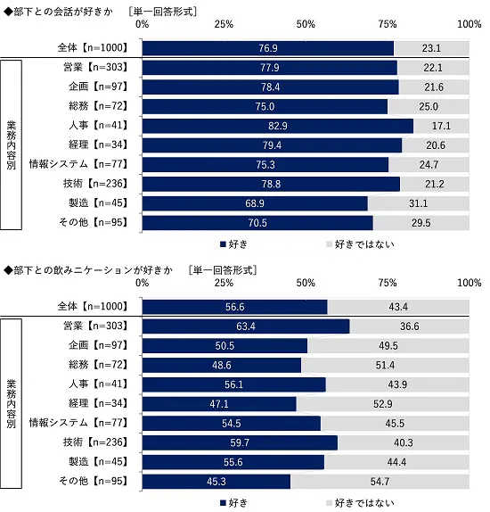 業務内容別にみると、部下との会話が好きという人の割合は、人事(82.9%)が最も高くなり、経理(79.4%)、技術(78.8%)が続きました。