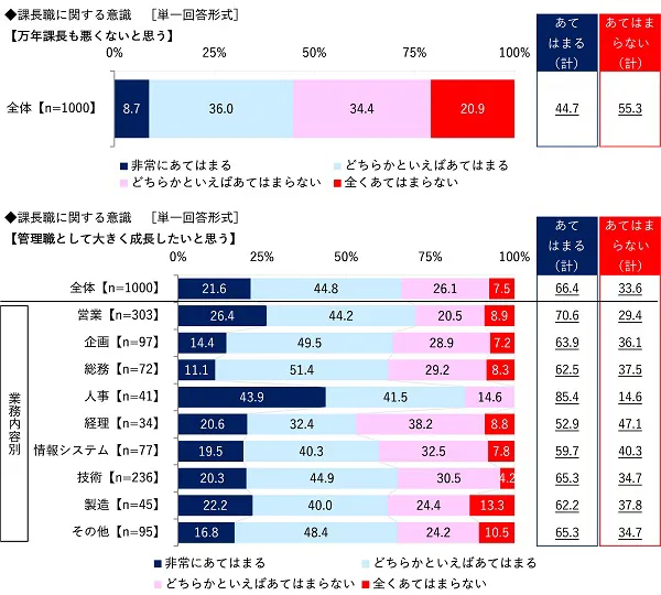 また、課長職に関する意識を聞いたところ、【万年課長も悪くないと思う】では『あてはまる(計)』は44.7%、『あてはまらない(計)』は55.3%となりました。