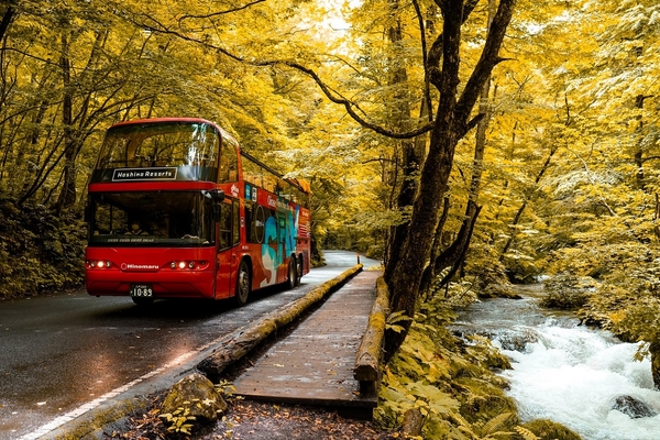 奥入瀬渓流(おいらせけいりゅう)沿いに建つ唯一のリゾートホテル「星野リゾート 奥入瀬渓流ホテル」は、2020年10月18日~31日の期間、「紅葉プレミアムオープンバスツアー」を実施します。 例年10月中旬から11月上旬にかけて、紅葉はピークを迎え、約70万人(*1)が奥入瀬渓流とその周辺を訪れます。そんな賑わいを増す時期ですが、早朝に行う当ツアーは、昼間とはまったく違った静けさや澄んだ空気を感じながら、これまでとは違った新たな目線で紅葉を楽しむことができます。また、オープンエアの2階建てバスで渓流沿いを走行するため、大自然の中を走り抜ける爽快感や、360度の絶景を存分に楽しめ、バスに乗っているだけで、国立公園の豊かな自然を満喫できるのも特徴です。東京で、2階建てオープントップバスツアー「スカイバス東京」を展開する、日の丸自動車興業株式会社(所在地:東京都文京区 代表取締役社長:富田浩安)と提携し、当ツアーが実現しました。紅葉を満喫できる渓流沿いを運行するバスツアーは、日本初です。