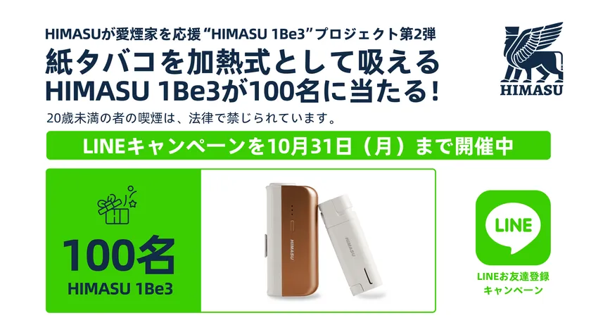 ヒマス株式会社(代表者:董希武)は、通常の紙タバコを加熱式として吸うことを可能にする新ジャンルのデバイスを展開する「Himasu(ヒマス)」(以下 Himasu)において、2022年10月のタバコ増税によりますます大きくなる喫煙者の経済的負担を支援することを目的に、『HIMASUが愛煙家を応援“SHIMASU”』プロジェクトを実施しております。今回はプロジェクトの第2弾として、タバコ価格の高騰により影響を受けている全ての方対象に、HIMASU 1Be3が100様に当たるキャンペーンを、LINEの公式アカウントにて2022年10月20日(木)~10月31日(月)の期間中実施いたします。