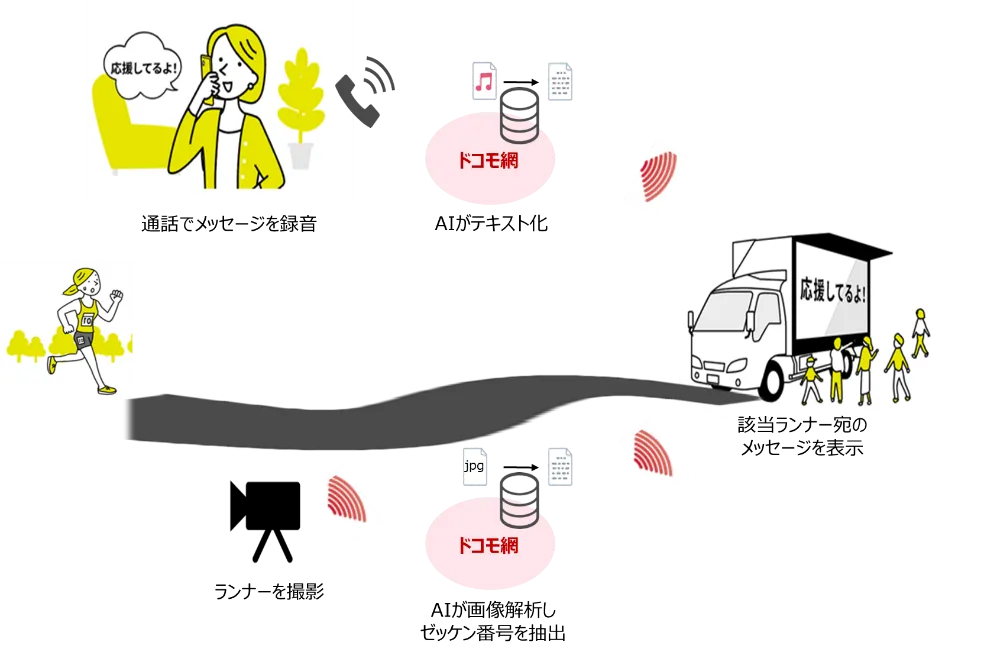 ランナーの家族や知人など日本中の方々からランナー向けの応援メッセージを集めます。通話相手の音声をリアルタイムで文字に変換できるドコモの「みえる電話(R)」のAI技術を活用したサービスである「みえる応援電話」を用いて、話した応援メッセージの声を音声認識機能でテキスト変換します。