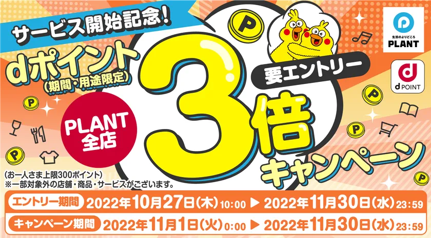 dポイントサービス開始記念 PLANT全店でdポイント3倍キャンペーンを11月1日~30日実施