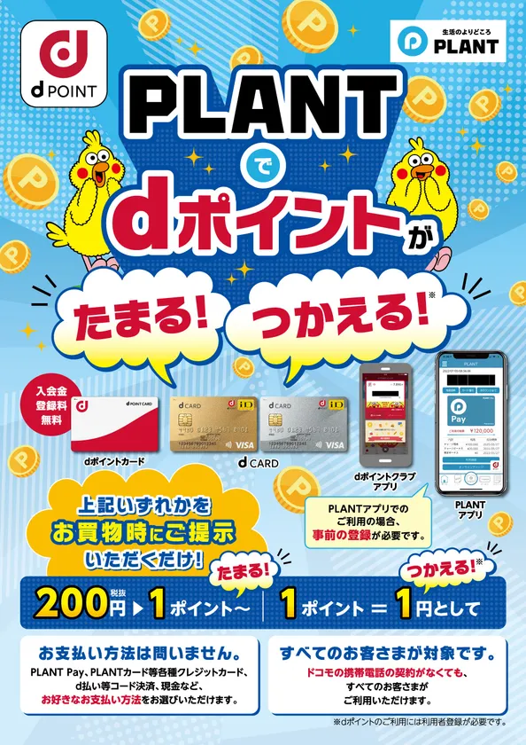 PLANTでのお買物の際にdポイントカード※2、dカード(R)、dカード GOLD(R)、dカード プリペイド(R)※3をご提示いただくことにより、お支払い額200円(税別)につき1ポイントの「dポイント」※4をためることができます。PLANTは、d払い(R)加盟店でもあるため、会計時にdポイントカードを提示した上で「d払い」でお支払いいただくと、d払い加盟店としての進呈分(税込200円につき1ポイント)もダブルでdポイントがたまり、とてもお得です。また、たまった「dポイント」は1ポイント1円としてPLANTをはじめとするdポイント加盟店でのお支払いなどにご利用いただけます。dポイントのご利用には、ドコモショップやWEBによる利用者情報登録が必要です。