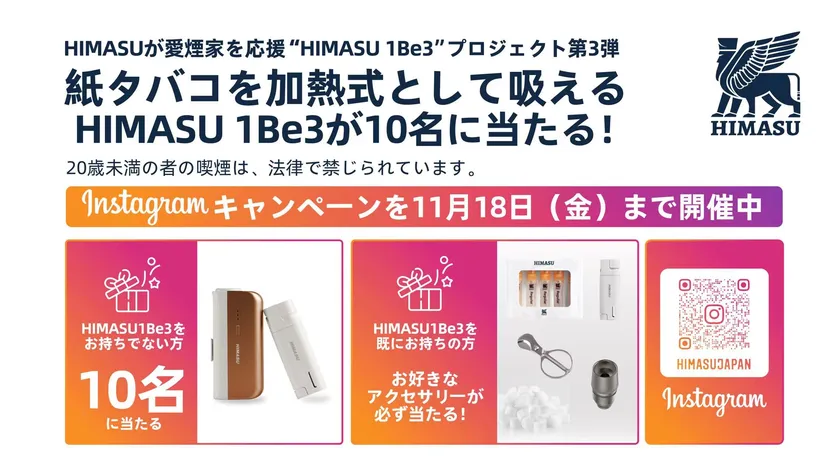 通常の紙タバコを加熱式として吸うことを可能にする新ジャンルのデバイスを展開する「Himasu(ヒマス)」(董希武、以下「Himasu」)は、2022年10月のタバコ増税によりますます大きくなる喫煙者の経済的負担を支援することを目的に、『HIMASUが愛煙家を応援“SHIMASU”』プロジェクトを実施しております。今回はプロジェクトの第3弾として、HIMASU 1Be3が10名様に当たるキャンペーンと、既に製品をお持ちの方にはお好きなアイテムが必ず当たるキャンペーンを、Instagramの公式アカウントにて2022年10月18日(火)~11月18日(金)の期間中実施いたします。