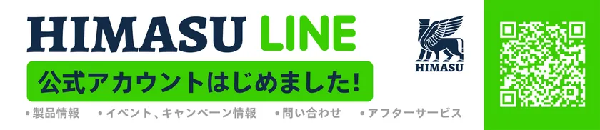 HIMASUでは、LINE公式アカウントを開設しました。キャンペーン参加時をはじめ、製品情報やイベント・キャンペーン情報を発信する他、各種お問い合わせやアフターサービスに対応いたしますので、是非お友達追加をお願いいたします。