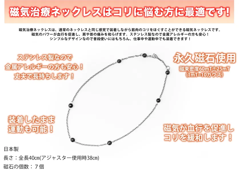 そのお悩みを解決するために、通常のネックレスと同じ感覚で装着しながら、筋肉のコリをほぐすことができる磁気ネックレスを開発いたしました。
