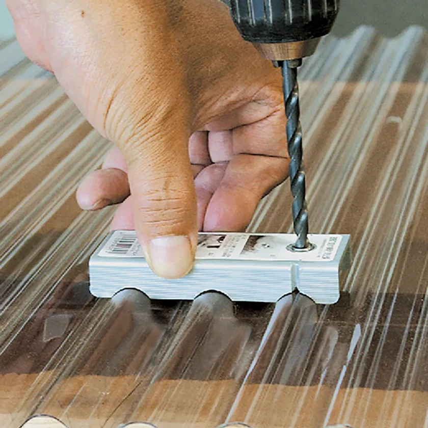 波板横滑り防止具は、波板加工において、垂木に波板を留めるために波板の山にドリルで穴をあける時に使用することで、滑りにくくなり簡単に穴をあけることができます。