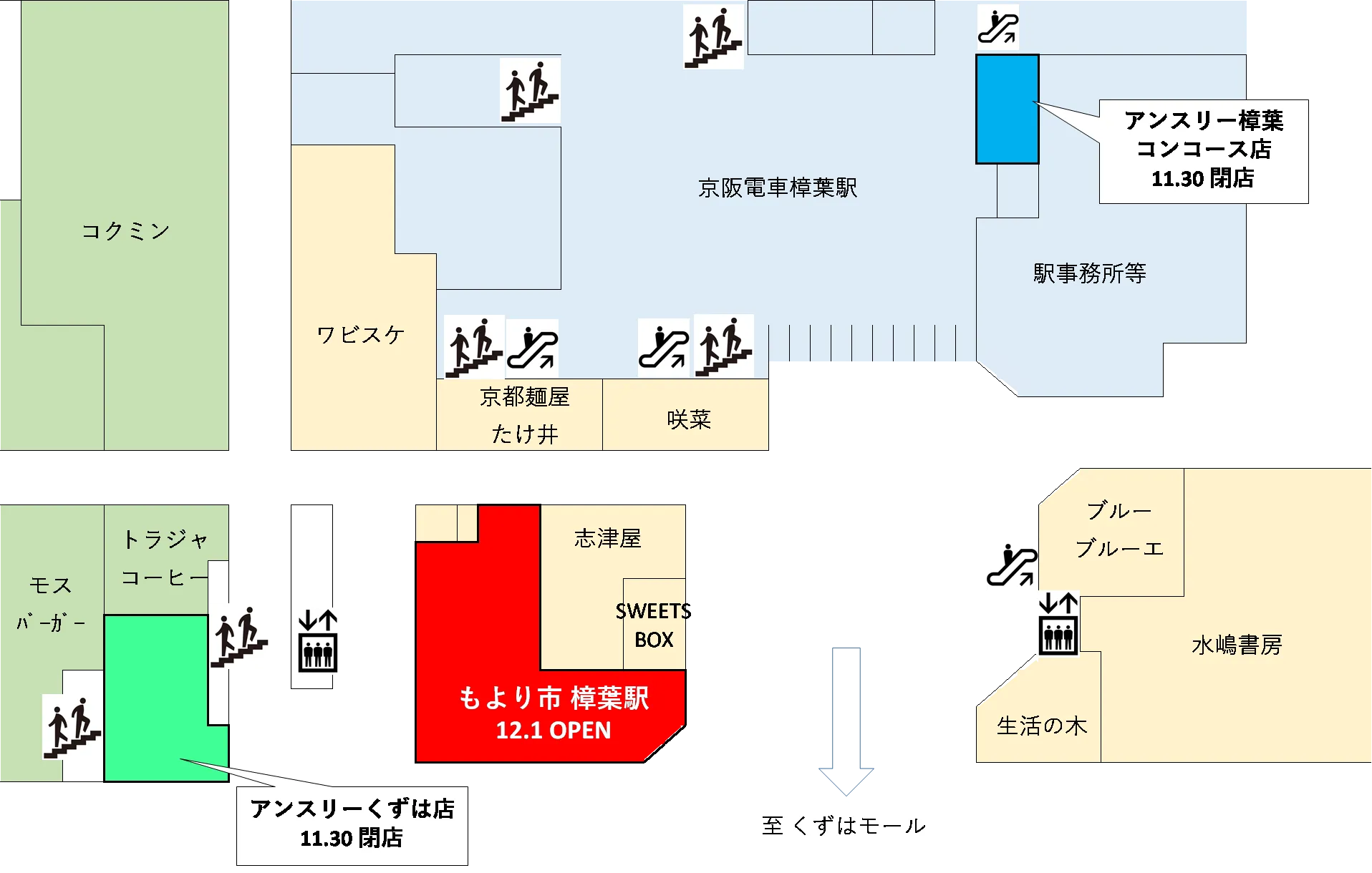 また、これまで樟葉駅にて営業を続けてきたミニスーパーマーケット「フレストプチくずは店」、駅ナカコンビニエンスストア「アンスリーくずは店」「アンスリー樟葉コンコース店」は閉店し、同駅での直営小売事業を「もより市 樟葉駅」に統合します。