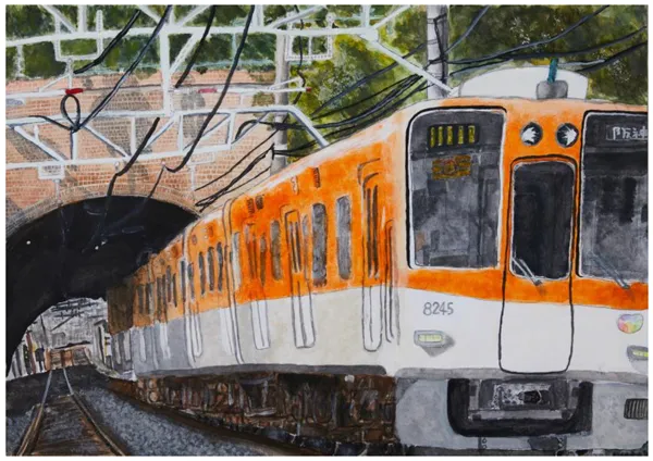 よくぞここまで丁寧に細部まで描き上げましたね。圧巻です。トンネルの中と外の光と影のコントラストが画面全体に立体感とリアルな質感を生み出し、まるで実写を見ているような不思議な感覚になりますね。枠を飛び出して描かれた8000系と全体に少し湾曲している構成がより一層の迫力とスピード感を表現できています。自分の目で見て感じたことを的確に表現する抜群のセンスを感じました。