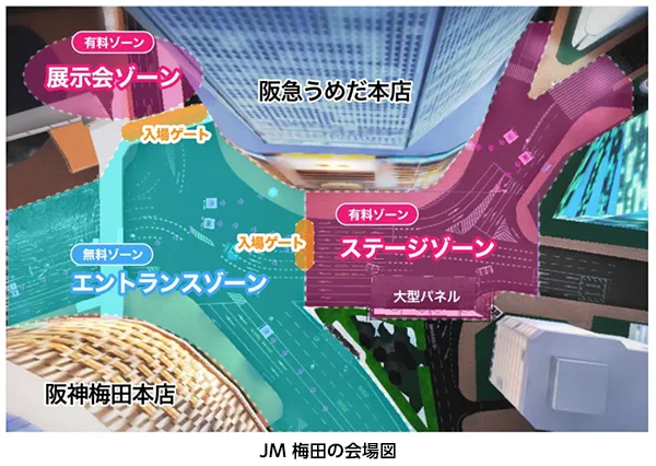 大阪・梅田にある阪急百貨店(阪急うめだ本店)・阪神百貨店(阪神梅田本店)前のエリアをメタバースに再現し、「ステージゾーン」「展示会ゾーン」「エントランスゾーン」を設けます。