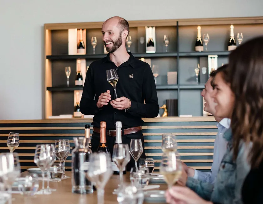 淡いゴールドの色調に、ムースのような繊細な泡。シトラスや青リンゴ、熟した洋梨のクラシックなシャルドネのアロマが豊かに香ります。口に含むと、塩気を帯びたミネラリーなエレガンスがはっきりと感じられます。生き生きとした酸味、滑らかなテクスチャーを堪能した後は、長期熟成由来のローストヘーゼルナッツなどのふくよかで複雑なアロマが余韻を締めくくります。