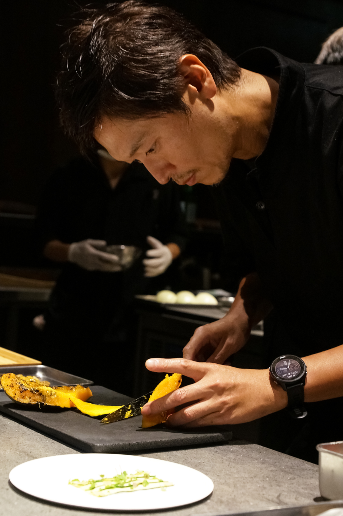ワインに合わせて撮影用にご用意いただいたのがカボチャの一品であるように、「野菜料理」も近年、川手シェフの“シグネチャー”の一部となりつつあります。フレンチのスペシャリテといえば肉料理やフォアグラなど、高級食材をつかったものであることが普通でしたが、フードマイレージやフードロス、地球全体のカロリー効率、「未来をよくする持続可能な食」に向き合う中、そんな伝統さえも(自然な帰結として)疑い、鮮やかに美味しい別解を提示される川手シェフ。「当たり前にある食材に新たな価値をつけ、再発見・再認識を提供する」ことを、都心から発信する、東京ならではのサステナビリティと考えているのです。