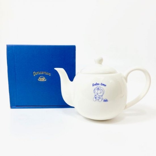 きれいなホワイトカラーのポットの前面に、リラックスしているドラえもんがデザインされています。